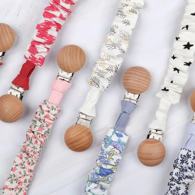 Corrente de chupeta de algodão para bebê, clipe de chupeta de madeira de faia, brinquedos de dentição infantil, suporte para mamilos, mordedor de bebê